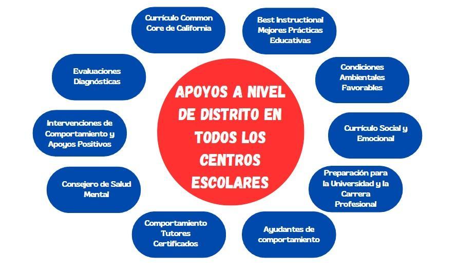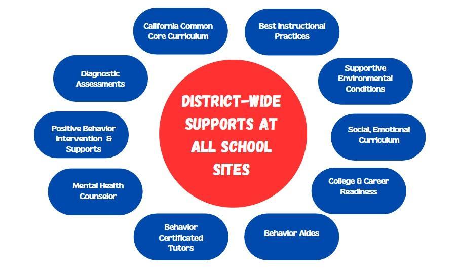La subvención requiere que el distrito involucre a todos los socios educativos, incluidos los administradores del distrito y del centro, el personal certificado, el personal clasificado, los padres, los estudiantes y los miembros de la comunidad. A continuación se muestra una lista de los apoyos de todo el distrito que fueron identificados y compartidos con todos los socios educativos en las reuniones relativas a las Escuelas de la Comunidad.