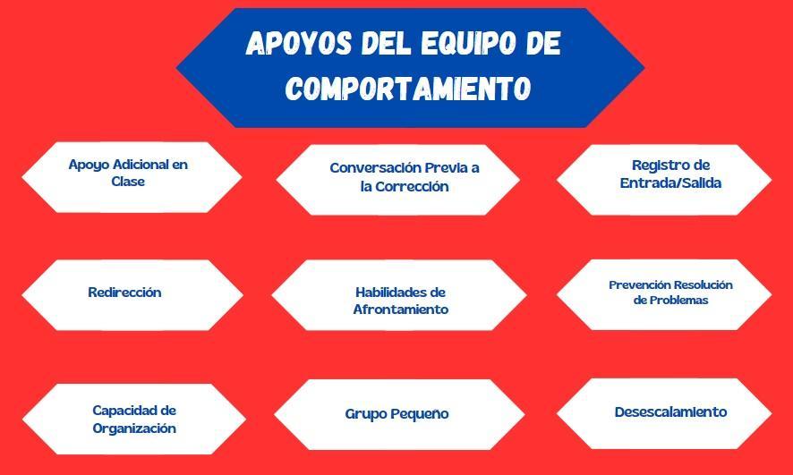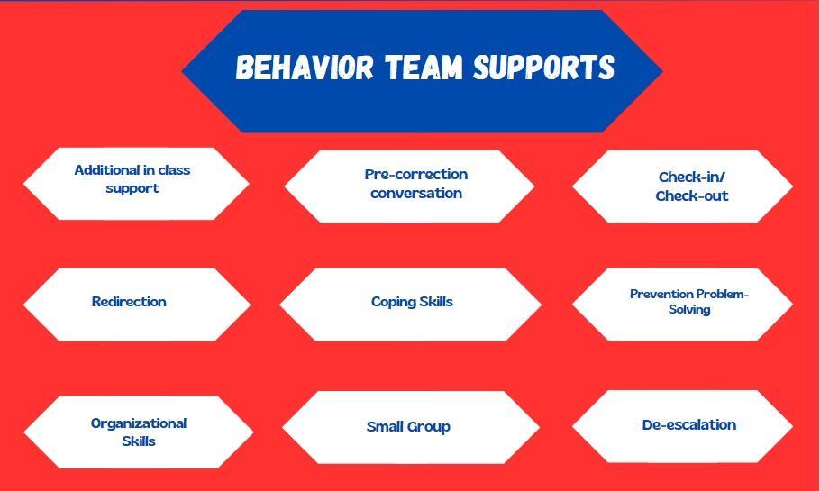 Las primeras discusiones sobre las necesidades de los estudiantes y el personal llevaron a la creación de un Equipo de Comportamiento en cada escuela para proporcionar apoyo social y emocional a TODOS los estudiantes. La imagen de abajo muestra algunos de los principales apoyos proporcionados por el Equipo de Comportamiento.