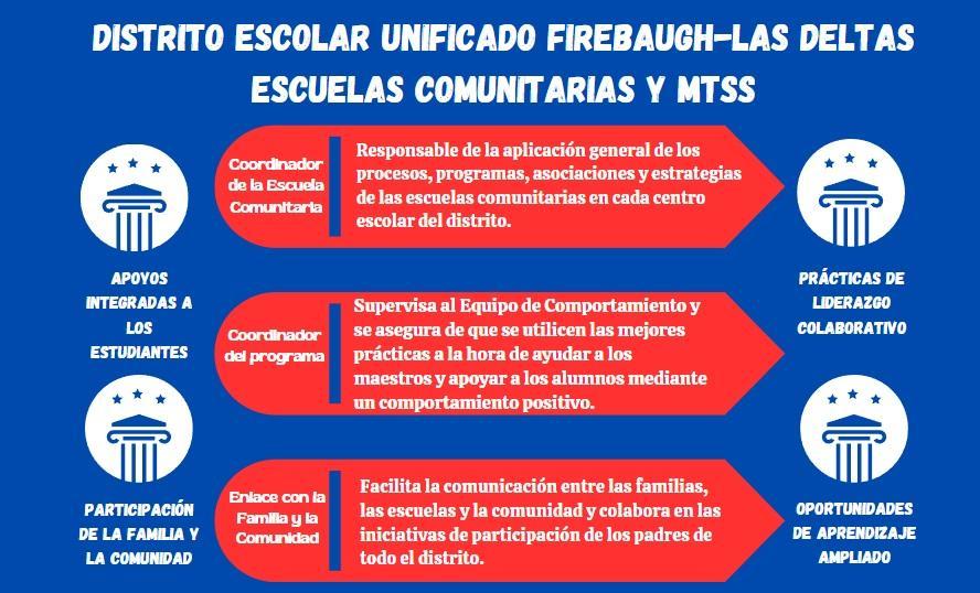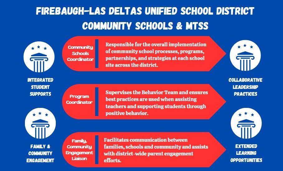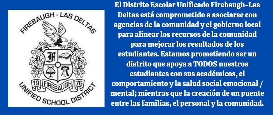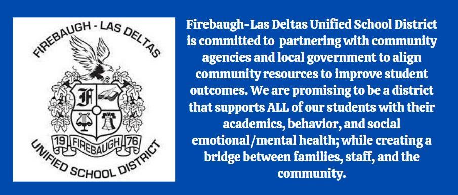 El Distrito Escolar Unificado Firebaugh-Las Deltas recibió una subvención de cinco años del Programa de Asociación de Escuelas Comunitarias de California en 2022 que permitió al distrito identificar las necesidades de TODOS los estudiantes mediante la contratación de personal para trabajar en estrecha colaboración con el personal del distrito, padres, estudiantes y miembros de la comunidad. Escuelas de la Comunidad se basa en cuatro pilares.